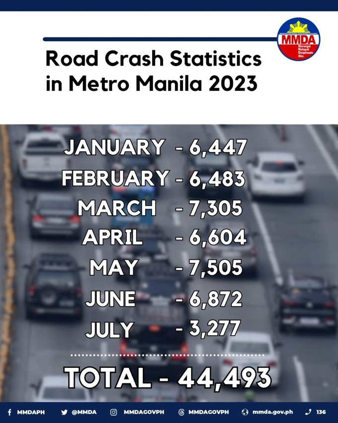 The Metropolitan Manila Development Authority (MMDA) has recently released the road accident figures from the beginning of the year up to the end of July. The tally: 44,493.