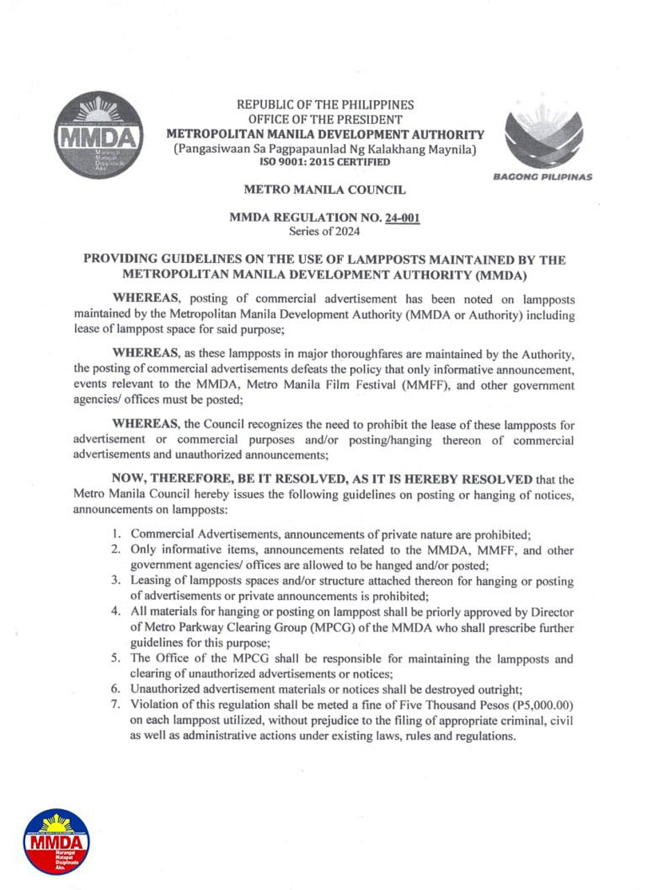 This comes after the government agency announced that putting commercial ads on lamp posts maintained by the MMDA is no longer allowed under regulation no. 24-001. That means products and announcements of a private nature are now prohibited from being placed on MMDA-maintained lamp posts. Even the leasing of lamp post spacing is no longer being allowed by the agency.