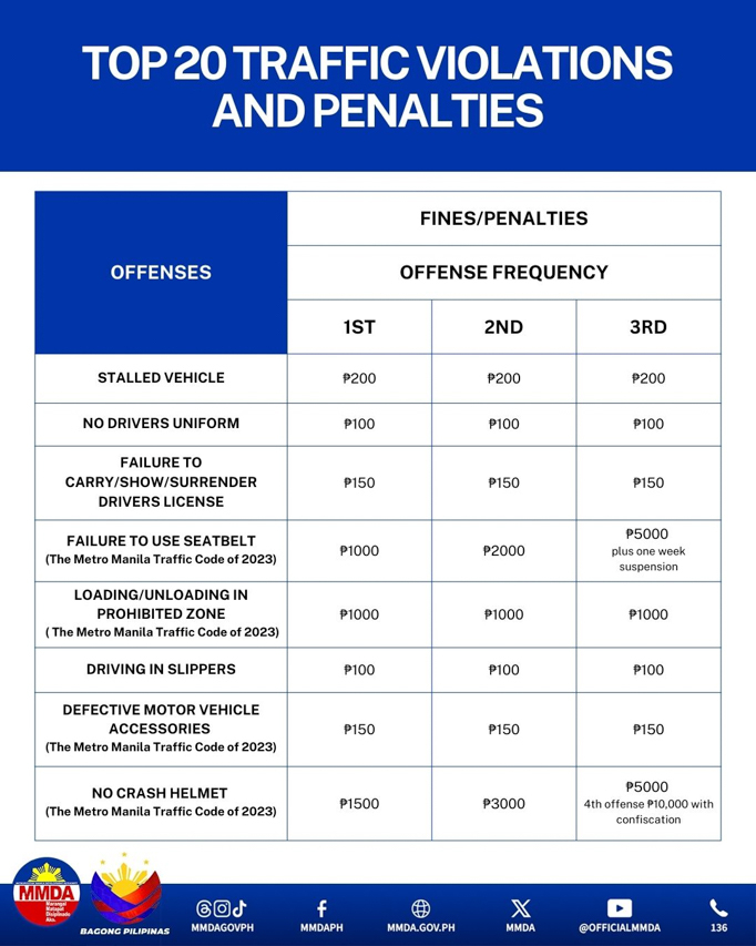 Now, according to the MMDA, these are the top 20 traffic infractions with their corresponding fines that motorists commit daily, as compiled by the agency’s Traffic Ticket Management Division: