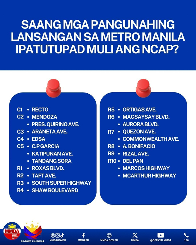 According to the MMDA, only major Metro Manila roads under their jurisdiction will be covered by the returning NCAP: