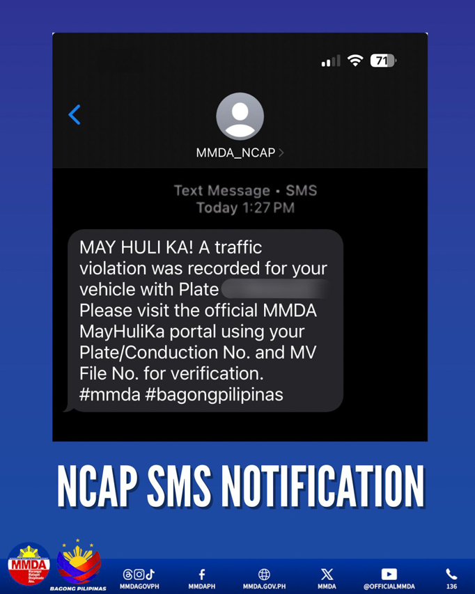 The official SMS notifications will come from “MMDA_NCAP”—which is not a standard cell phone number—while emails will be sent from “no-reply@mmda.gov.ph.”