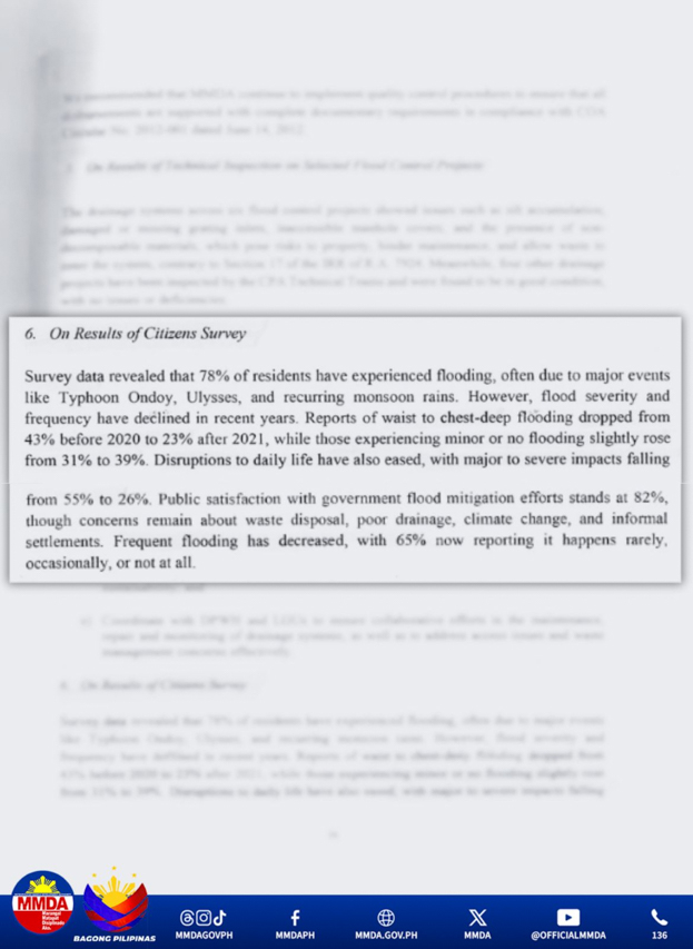 ‘A significant decrease in flooding’ was noted in the Citizen Participatory Audit (CPA) for select flood control projects of MMDA from January 1, 2021 to June 30, 2024, where those directly affected and serviced by the selected projects and implemented in the said period said they are satisfied with the projects and interventions undertaken by the agency.