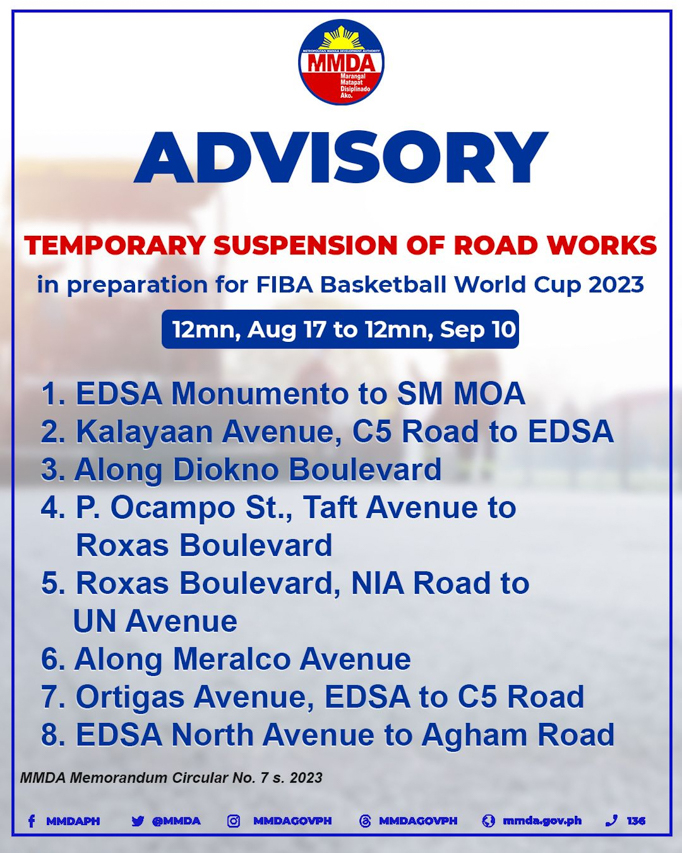 The Metropolitan Manila Development Authority (MMDA) has issued a new memo that will temporarily ban all roadworks and mall-wide sales in select parts of Metro Manila from August 17 to September 10, 2023. This is part of the agency’s preparations for the upcoming FIBA Basketball World Cup 2023.