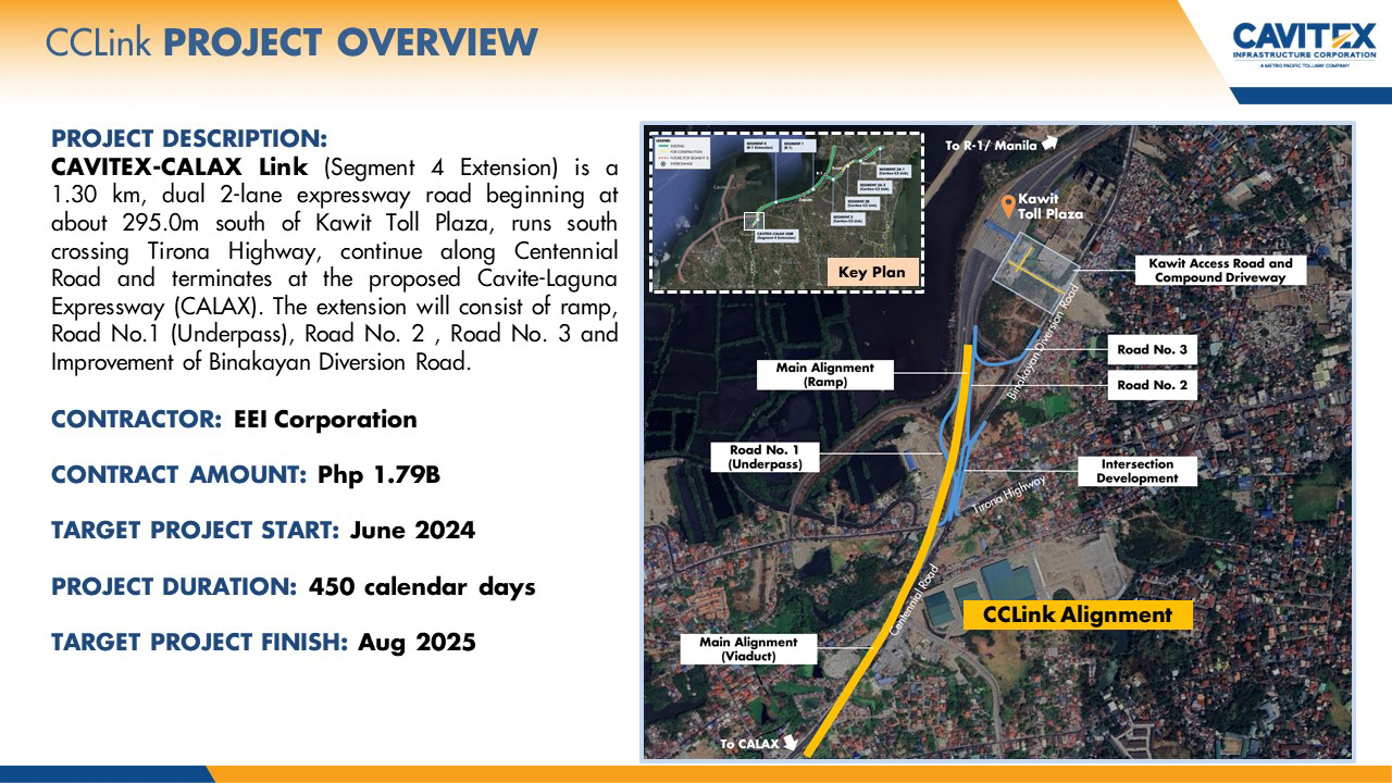 Dubbed the CAVITEX-CALAX Link (CCLink), this expressway will connect the Cavite-Laguna Expressway (CALAX) to CAVITEX in Kawit, Cavite. With a contract price of PHP 1.79 billion, EEI Corporation will construct a 1.2-kilometer, 2x2 lane expressway extending from the CAVITEX Kawit Toll Plaza to the upcoming CALAX Kawit Interchange. The construction of the link is targeted to commence next month and is set to be operational by mid-2025.