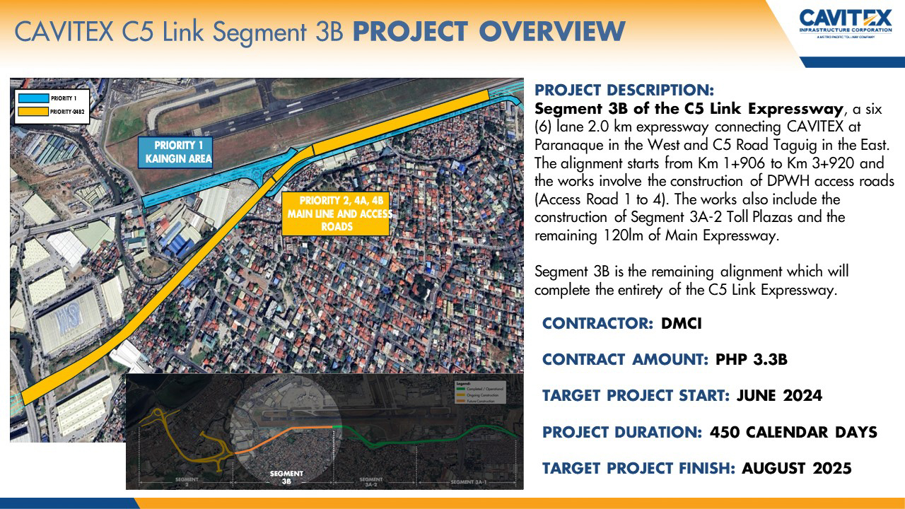 Meanwhile, CIC also inked another multi-billion peso contract with D.M. Consunji, Incorporated (DMCI) for the remaining C5 Link Segment 3B. Under this PHP 3.3 billion contract, roadworks, drainage, mechanical, electrical, plumbing, fire protection, sanitary systems, and toll plazas for the 2-kilometer, 3x3 lane Segment 3B from Kaingin to RSG Subdivision will be constructed by DMCI. According to CIC, construction of this segment is targeted to commence by the second half of 2024 and is expected to be operational by 2025.