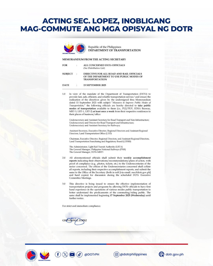 Starting this week, officials of the Department of Transportation (DOTr) are now required to use public transportation at least once a week, following a new memo issued by Acting Secretary Giovanni “Banoy” Lopez.