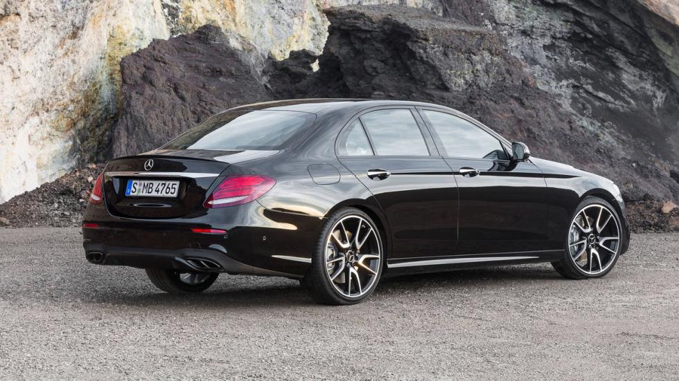 The rear is equipped with two chrome-plated exhaust pipes, wraparound taillights and a lip spoiler painted in body color. The Mercedes-AMG E43 is finished off with 19-inch high-gloss light-alloy wheels.