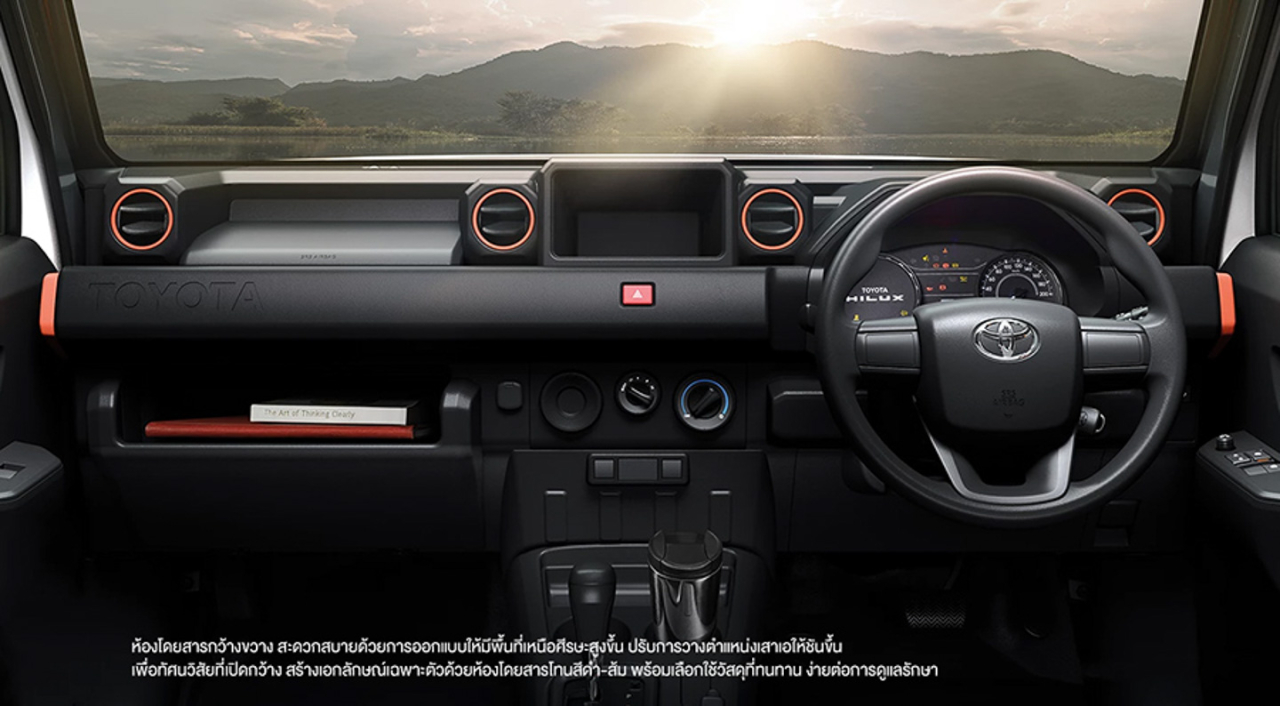 The cabin itself is also very utilitarian, featuring hard and durable plastics on the dashboard and door cards, with orange accents found on the A/C vents.