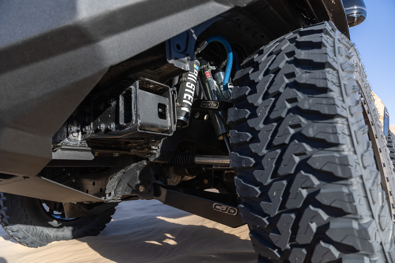For starters, it has a custom CJD Racing long-travel race suspension, which increases the factory suspension travel up to 16 inches. It also comes with custom-designed 10-inch Bilstein M 9200 coilovers and 10-inch Bilstein M 9200 bypasses. Complementing all that are custom-fabricated upper & lower control arms, 4340 drive axles, tie rods, misalignment spacers, front spindles, trailing arms, extended shock towers for the rear, and extended brake lines.