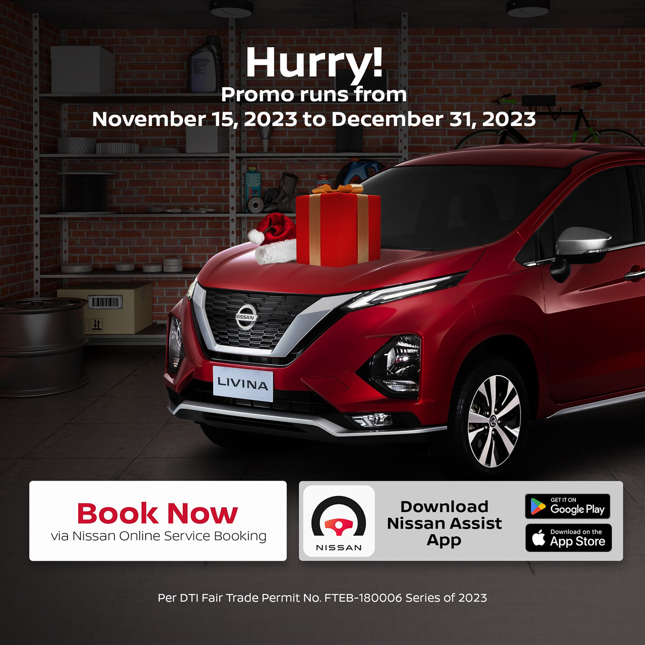 This special promo is available until December 31, 2023. For more information on the Nissan Holiday.Hooray.Hot Deals (Ho!Ho!Ho!) Promotion, visit https://www.nissan.ph/service/ASChristmasPromo.html.