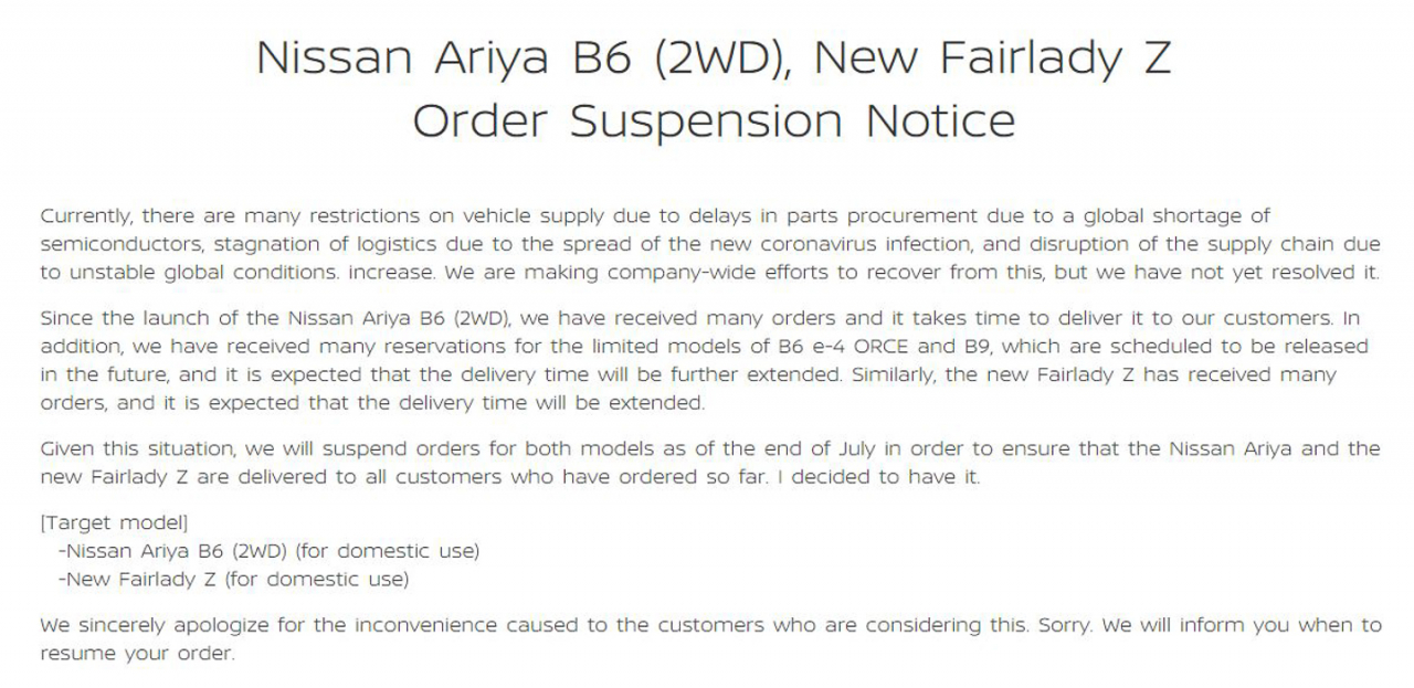 In the case of customers in Japan who have already ordered either the Z or the Ariya EV, Nissan also announced that the delivery time for their units will be further extended.