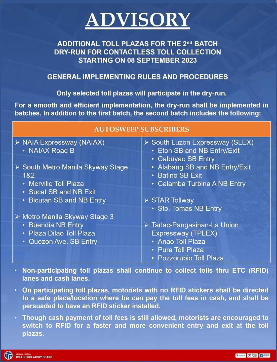 The last few toll plazas that are not included in the list of participating booths shall still continue to collect tolls through RFID and cash. Meanwhile, motorists who have yet to avail of RFID stickers and will pass through the participating toll plazas will be directed to a safe location where they can pay the toll fees in cash, and at the same time be persuaded to have an RFID sticker installed.