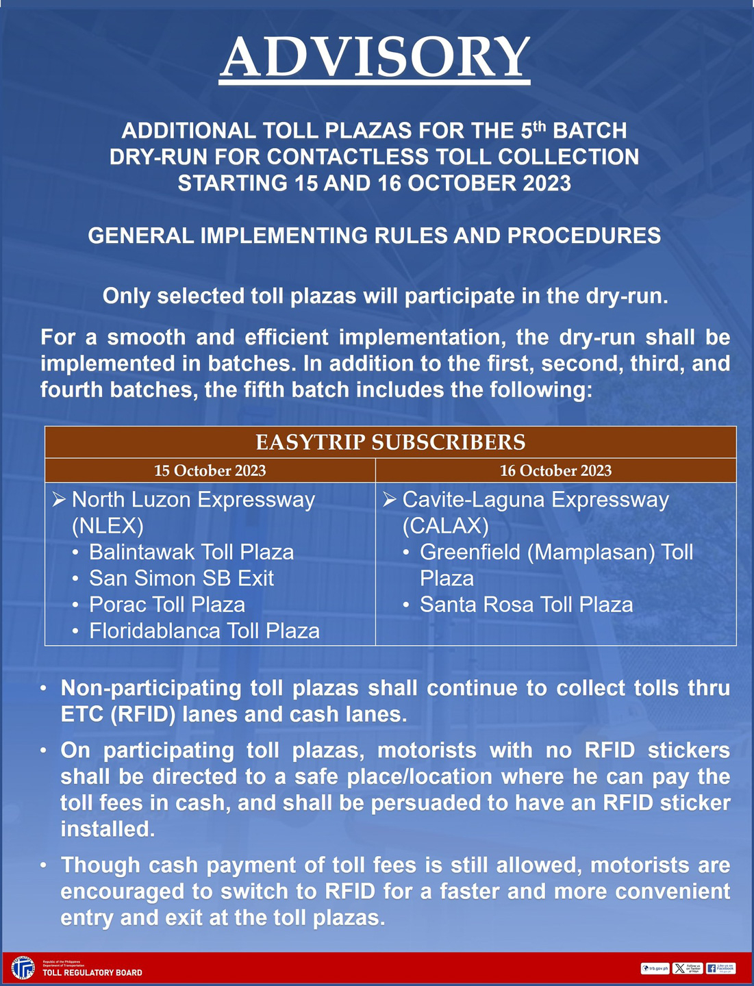 On the other hand, the Cavite-Laguna Expressway (CALAX), which also uses Easytrip RFID, will also have its Greenfield (Mamplasan) and Santa Rosa Toll Plazas adopt RFID-only lanes by Monday, October 16.