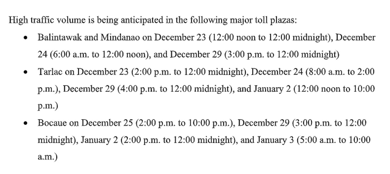 Traffic management teams will monitor the traffic situations in Balintawak, Mindanao, Karuhatan, Valenzuela (Paso de Blas), Meycauayan, Marilao, Bocaue, Sta. Rita, Pulilan, San Simon, San Fernando, Clark South, Tarlac, Tipo, and Subic Freeport Expressway (SFEX) as a high volume of vehicles is expected in these areas.