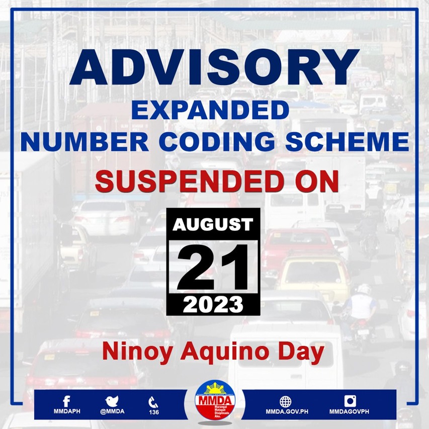 The Metropolitan Manila Development Authority (MMDA) has announced the suspension of the Expanded Number Coding Scheme, aka 'number coding', this coming Monday, August 21, 2023, Ninoy Aquino Day.