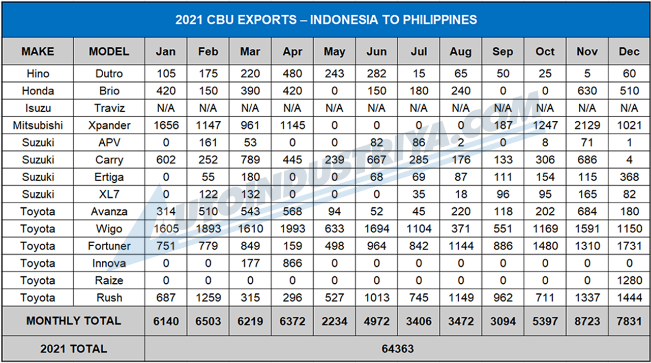 GAIKINDO (the Indonesian counterpart to CAMPI/AVID) reports that a total of about 64,363 units were exported to the Philippines in 2021. The total includes reports from a variety of brands producing models in Indonesia, and all of these are Japanese automakers. The only caveat with the total number is that it is incomplete because one automaker in Indonesia did not report their export numbers to GAIKINDO, and that is Isuzu with regards to the Traga; in the Philippines, that model is known as the Traviz.