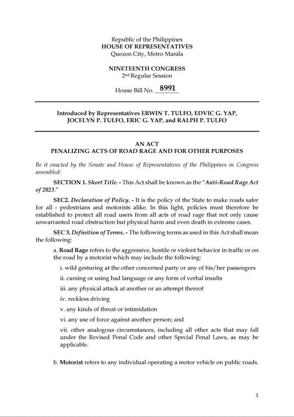Representatives Erwin Tulfo, Edvic Yap, Jocelyn Tulfo, Eric Yap, and Ralph Tulfo co-authored House Bill (HB) 8991. If it becomes a law, it will be titled the Anti-Road Rage Act.