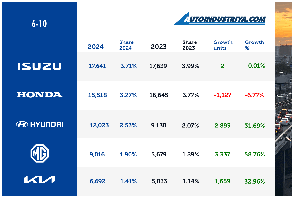 MG improved to 9th with 9,016 units sold in 2024, up 58.76% from the previous year. 2024 was SAIC Motor Philippines's first full year as a national sales company with the MG brand.