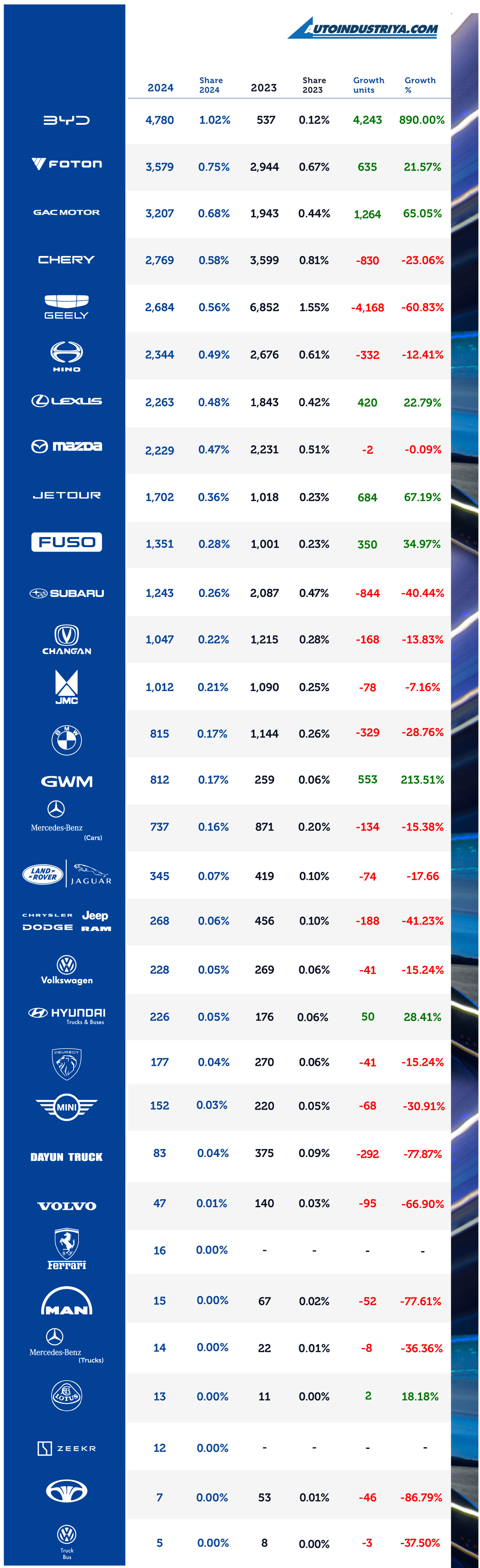 Brands that saw a serious sales slump in 2024 were BMW, Chery, Geely, Mini, and Subaru. BMW had a challenging year as it dropped out of the 1,000 unit mark, declining 28.76%. Chery sales slipped by 23.06% as an aging lineup failed to drive customers to showrooms as they faced competition with fresh new offerings.