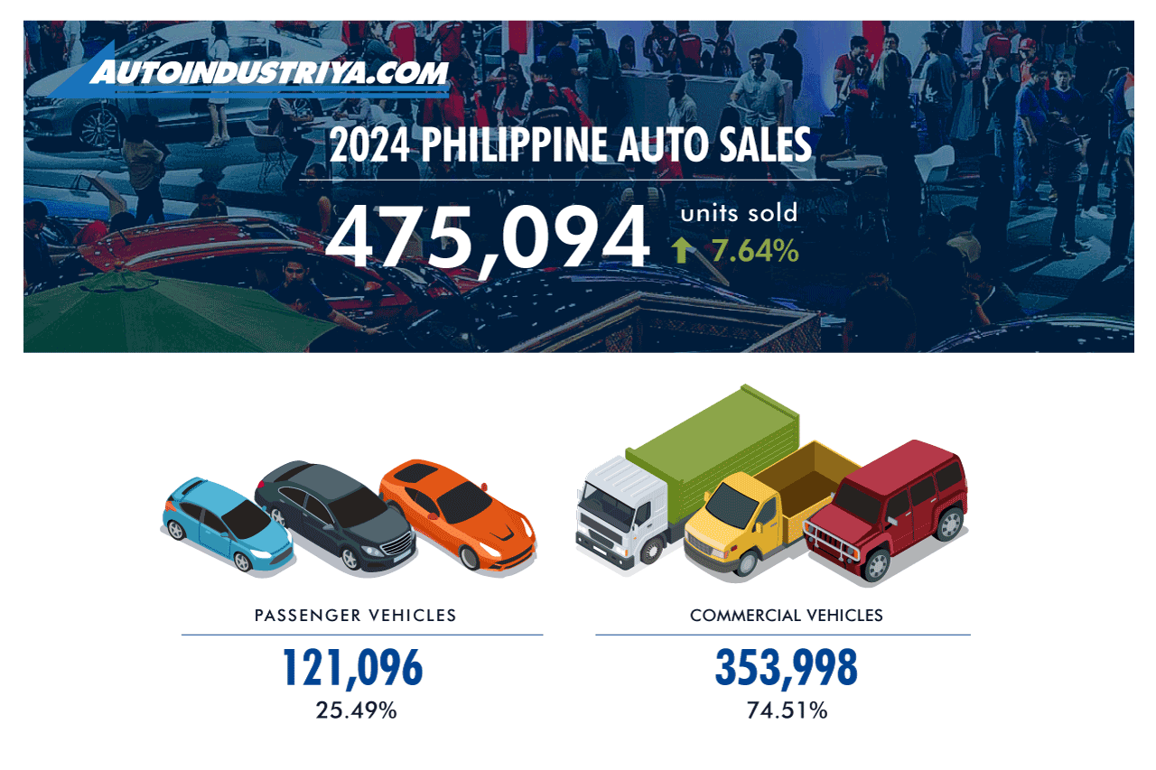 Philippine auto sales for 2024 grew 7.64% to 475,094 units, adding 33,701 units from the previous year's 441,393 total.