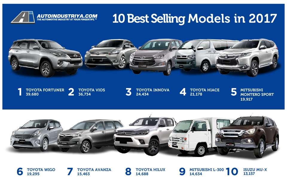In alphabetical order, the best-sellers of 2017 are the Isuzu mu-X, Mitsubishi Montero Sport, Mitsubishi L300, Toyota Avanza, Toyota Fortuner, Toyota Hiace, Toyota Hilux, Toyota Innova, Toyota Vios and Toyota Wigo.