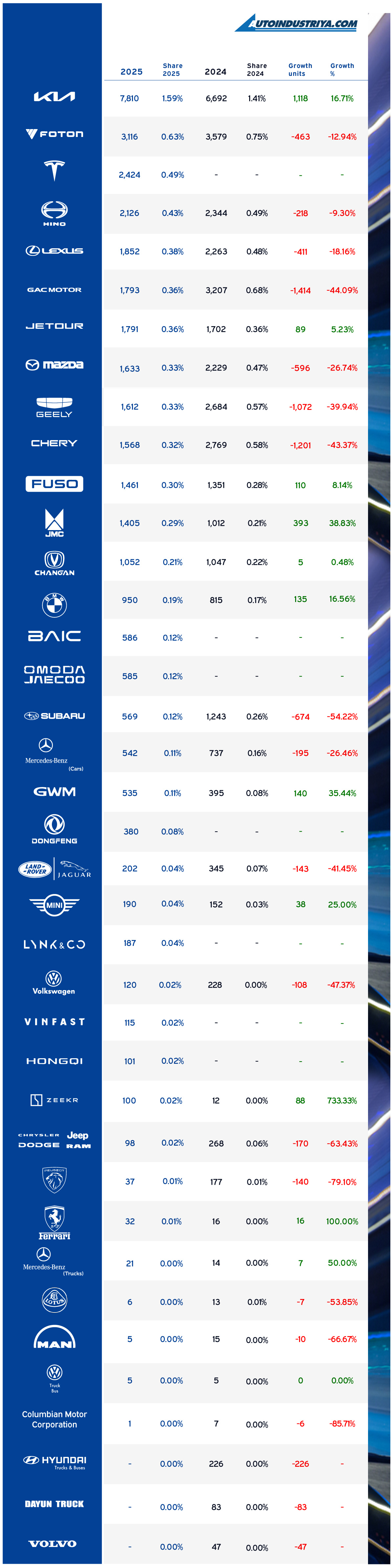 *Hyundai Truck & Bus, Daiyun, and Volvo were not able to submit 2025 sales figures to us as of publication time. So we have marked them nil.