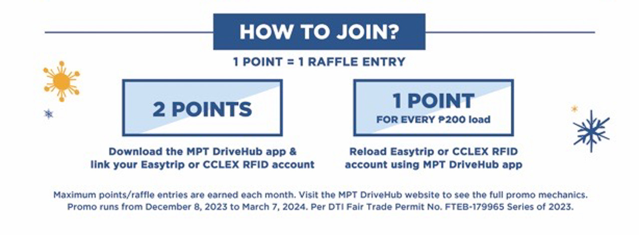 Those interested in joining will only need to download and use the MPT DriveHub app on their smartphones and register. Afterward, users will have to link either their Easytrip or CCLEX RFID account to the app. This alone will net new users 2 points for the raffle. On the other hand, every PHP 200 worth of reload using the MPT DriveHub app will net users 1 point.