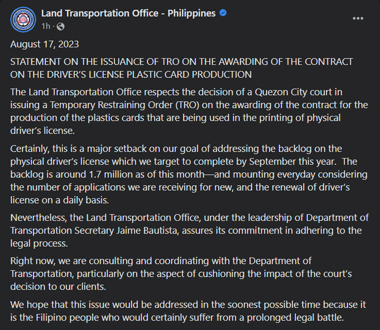 The LTO, on the other hand, issued a statement, saying that the decision was a setback but respects the Court’s decision.