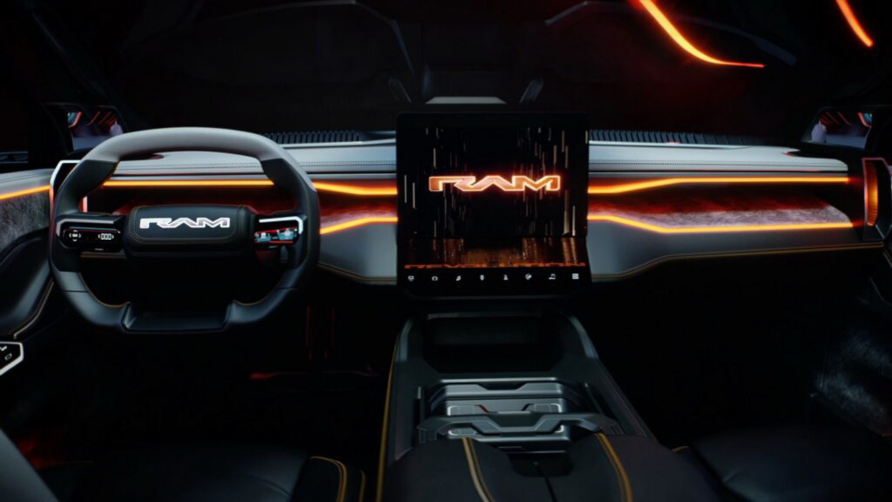 Still, it's hard to miss the Revolution's different front end that features an illuminated “RAM” badge, unique LED lighting signatures, a muscular hood, and an aggressive front bumper. The rest of the truck combines a curvaceous bed, specially-designed rear suicide doors, and inverted L-shaped LED taillights integrated into the tailgate. Since it has no engine up front, Ram says the electric pickup concept has a cab-forward design, allowing them to make the interior more spacious while retaining the same bed length as production trucks.