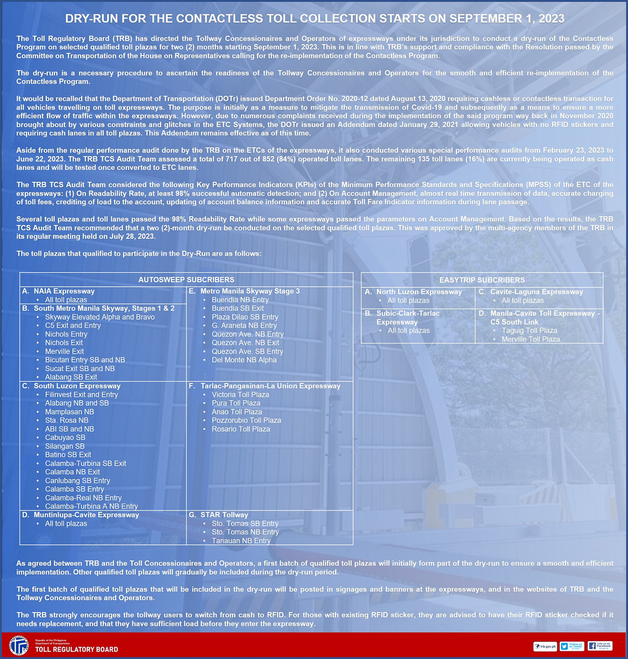 In the TRB's recent performance audits of ETCs on expressways from February 23 to June 22 of 2023, it assessed a total of 717 out of 852 or 84% toll lanes used the cashless system. The remaining 135 toll lanes or 16 % are cash lanes and will be tested once converted to ETC lanes.