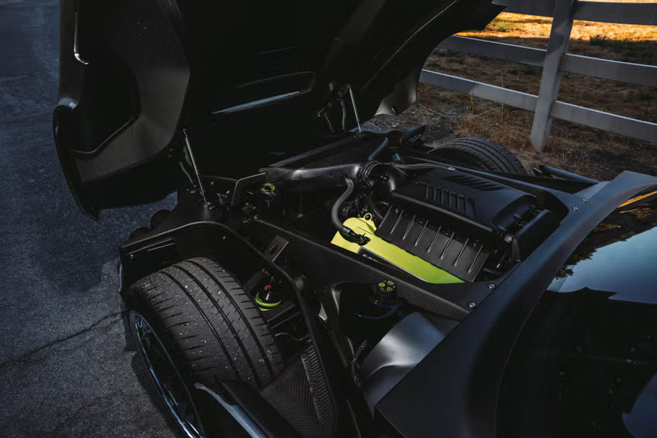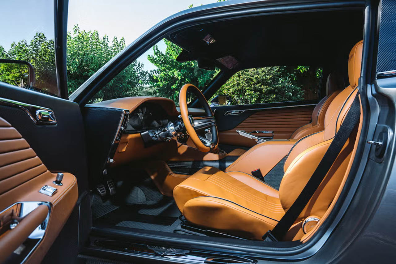 It might not be obvious, but the wheelbase has been extended by 3.0 inches, the track widened by 8.0 inches, and the rear width stretched by another 10.0 inches. Evidenced by how it looks, the design emphasizes the long hood and the integrated rear decklid spoiler to create a more dramatic fastback silhouette. To conceal all that carbon fiber, it is finished in custom Double-0 Silver paint with Nuclear Olive Green accents.