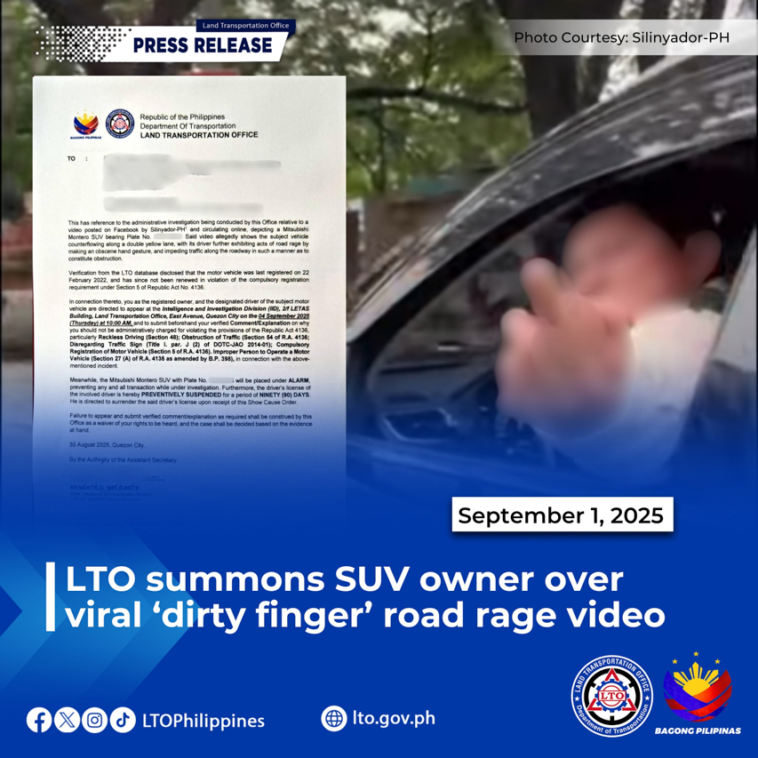Recently, the Land Transportation Office (LTO) suspended a driver’s license for 90 days to an individual who was caught on video giving the middle finger to another motorist.