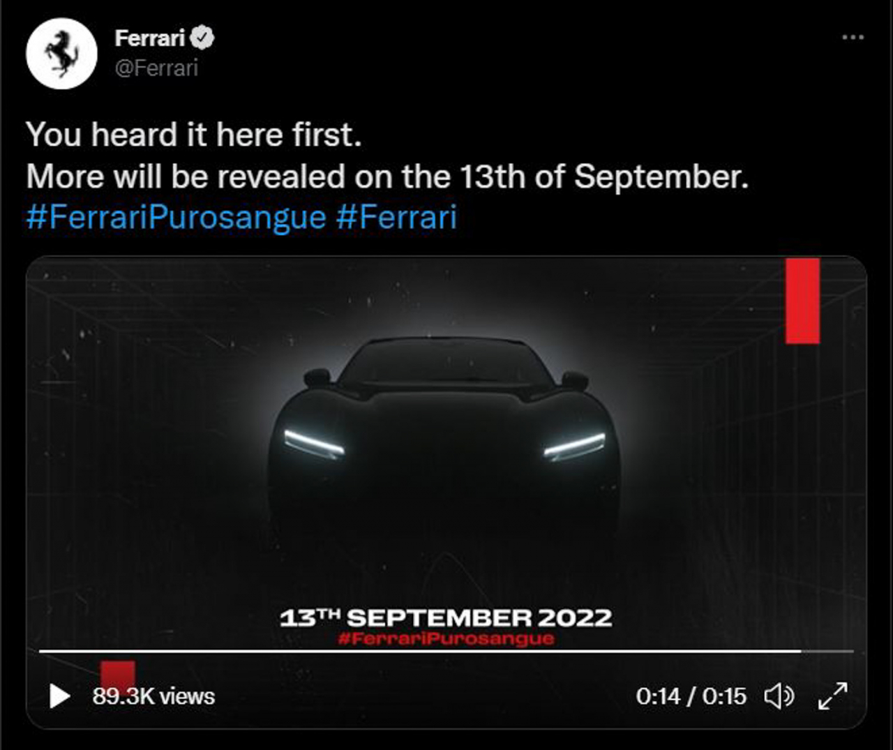 Ferrari has made it clear on its official Twitter page that it is revealing more details about the Purosangue SUV on September 13. They made the announcement with a 15-second teaser video showing only the new model's LED headlights, while the sound of its V12 engine is roaring in the background.