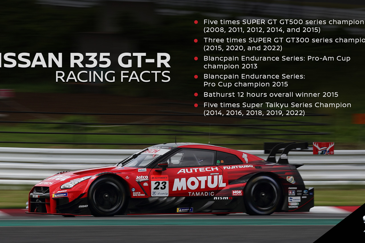 The GT-R also made a name for itself in motorsports. It was able to take home five GT500 Class victories and three GT300 class wins in Japan's Super GT Championship. It also won in the 2013 Blancpain GT Series Pro-Am Class, a Bathurst victory in 2015, and five Super Taikyu Japanese endurance racing series wins.