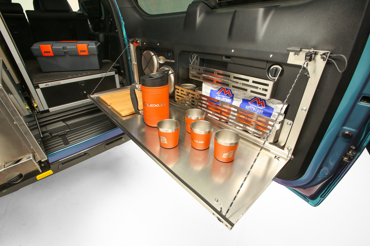 Once you've already picked your campsite, the GX 460 Overland Concept features a rear cargo area that's been fitted with plenty of equipment suited for the great outdoors. It gets Goose Gear drawers, Kaon racks/tables, an ARB fridge, as well as a stove for cooking/heating meals.