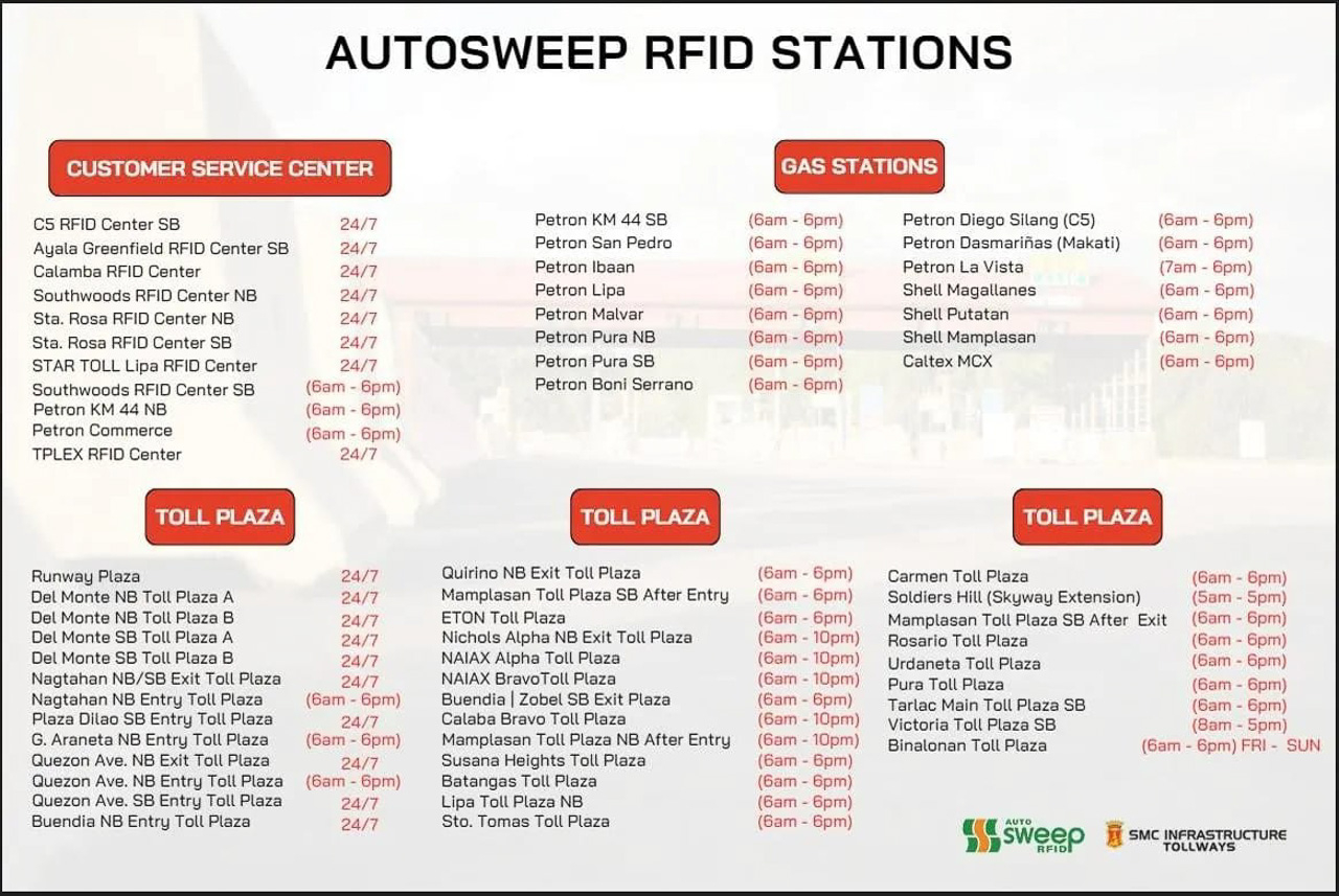 With Shell Magallanes set to cease offering RFID installation services, the Toll Regulatory Board has advised motorists to visit other RFID installation sites. Those who have yet to get their RFID stickers can do so by visiting the following sites;