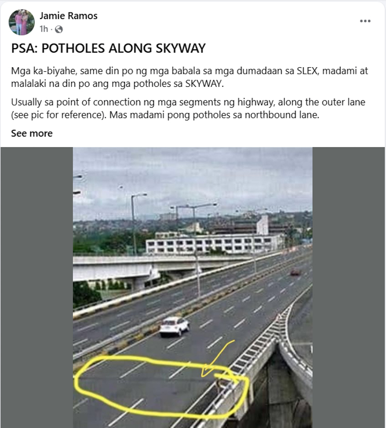 “Mga ka-biyahe, same din po ng mga babala sa mga dumadaan sa SLEX, madami at malalaki na din po ang mga potholes sa SKYWAY.
