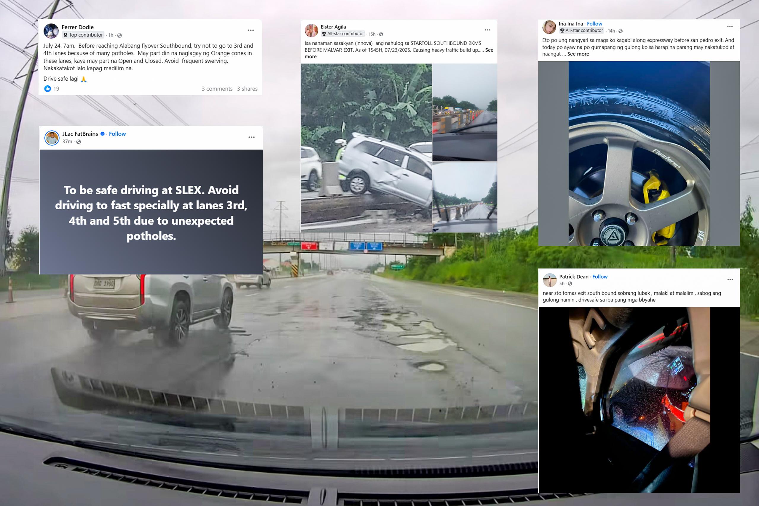 According to motorists who posted on the group, SLEX Traffic, the highway is littered with sharp potholes, with many of them falling victim to a punctured tire, or with bent/crooked alloy wheels.