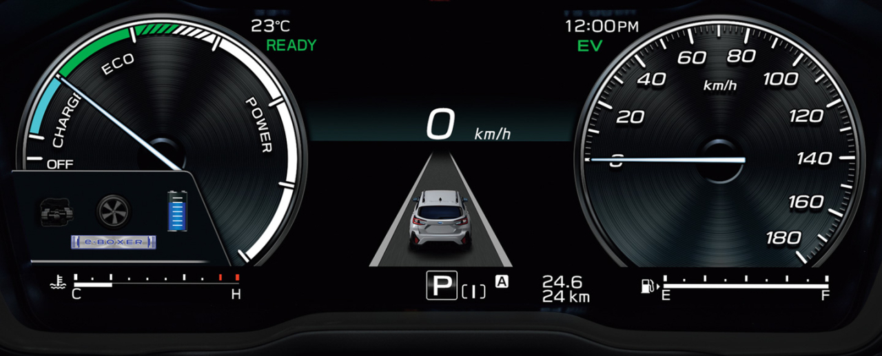 In the Japanese market Crosstrek, the system utilizes a 2.5-liter boxer engine that puts out 160 PS and 209 Nm of torque, and an MC2 AC synchronous motor powered by a 1.1 kWh lithium ion battery that gives a max output of 119.6 PS and 270 Nm of torque. While the S:HEV system features additional components for the Crosstrek, the basic layout of Subaru’s symmetrical AWD remains the same, retaining its mechanically coupled front and rear axles using a propeller shaft.