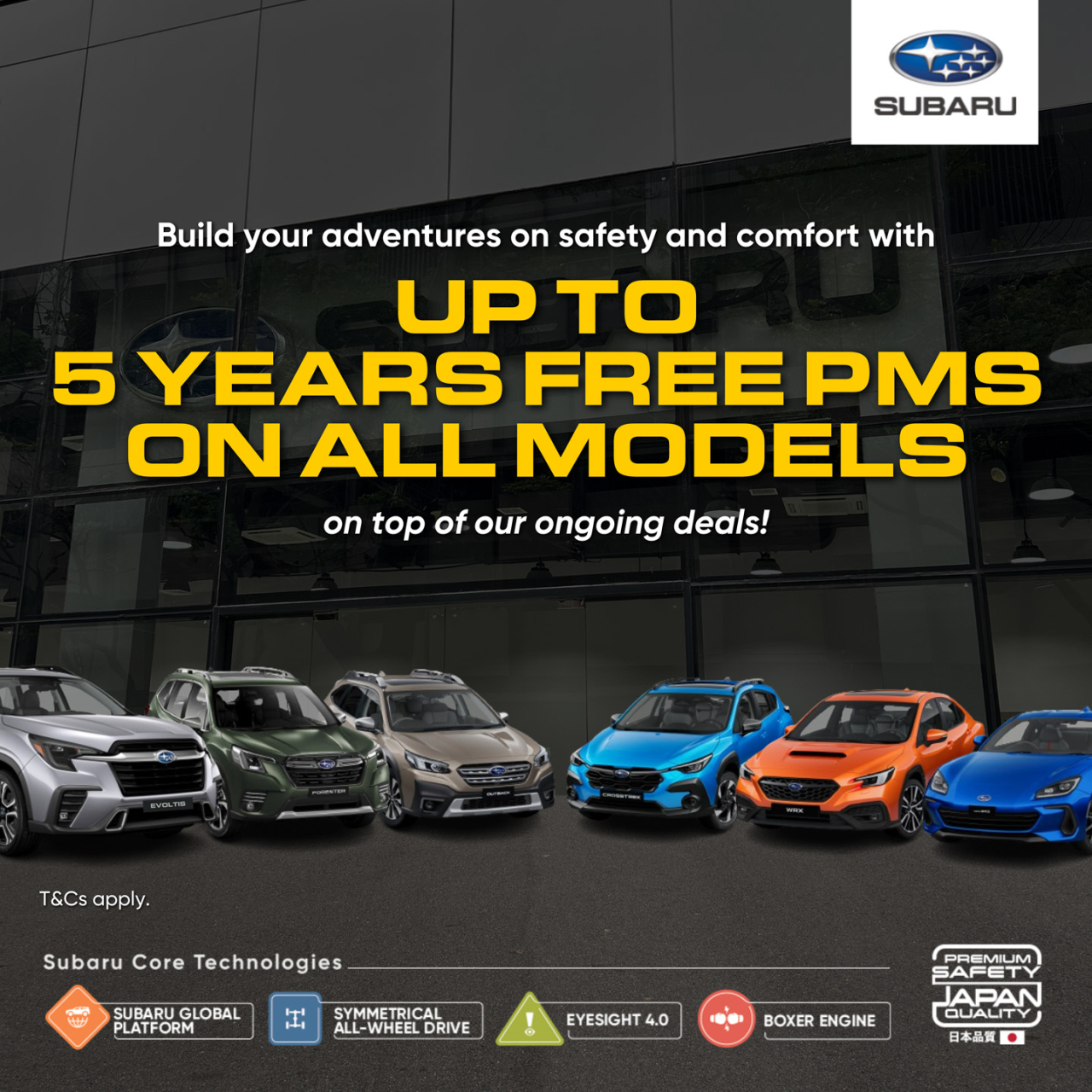 If the Subaru Evoltis is on your radar, the deal is even more generous. When you purchase this model, you’ll receive 5 years of free preventive maintenance services. This extended coverage demonstrates Subaru’s commitment to valuing your choice of their brand and ensures that your Evoltis remains in excellent condition for years. The PMS packages include up to 4 free visits at 6-month or 10,000-kilometer intervals, depending on which comes first. For the Evoltis, this translates to as many as 10 visits or 50,000 kilometers of maintenance coverage.