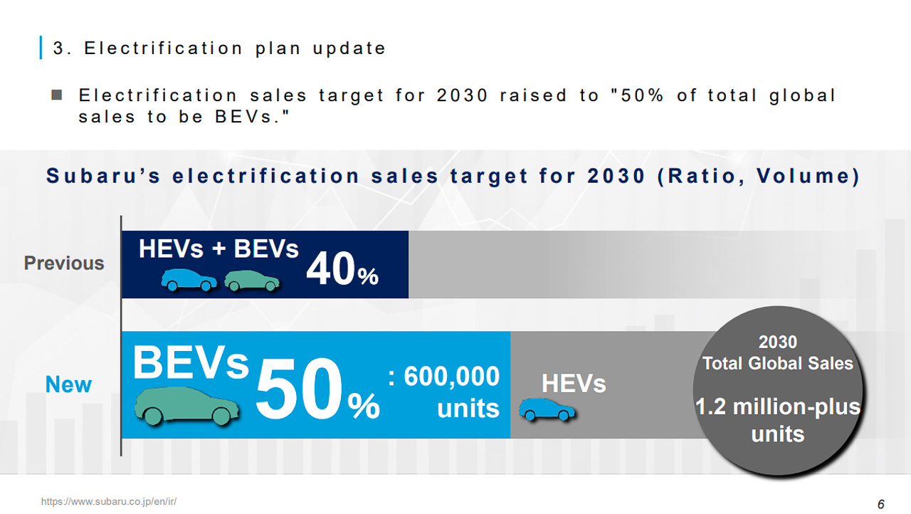 Before, Subaru's plan for 2030 was to have an equal 40% share of global sales between EVs and hybrid electric vehicles (HEVs). Now, that has been changed to 50% for both HEVs and EVs. This is in response to market changes in which more and more customers are switching to electrified vehicles.