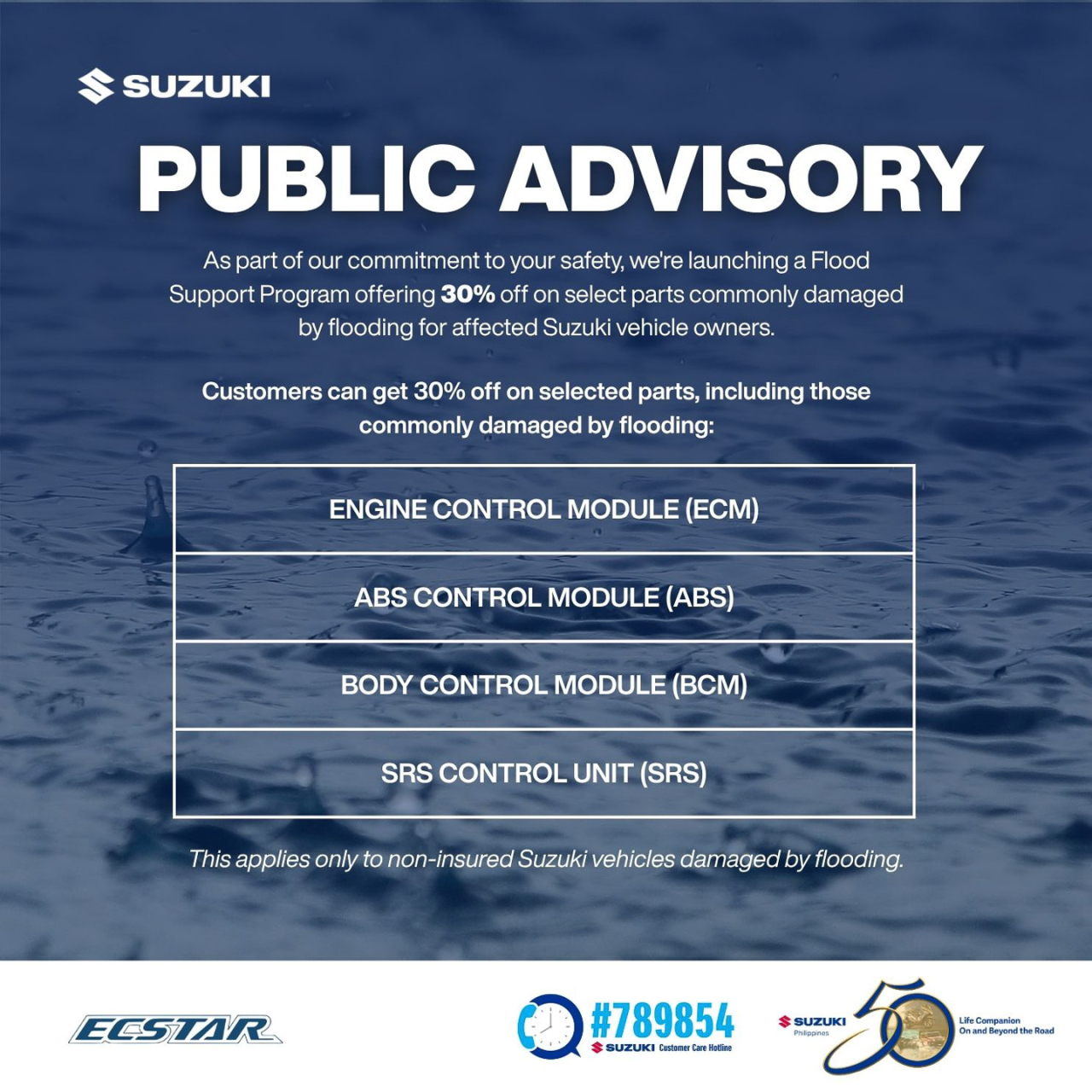 The assistance did not end on water. Recognizing that many private vehicles had also suffered severe water damage during the floods, Suzuki Philippines launched a Flood Support Program aimed at helping owners of Suzuki vehicles recover more easily. In line with the company’s commitment to safety and public welfare, this initiative offers a 30% discount on select control modules specifically the Engine Control Module (ECM), ABS Control Module, Body Control Module (BCM), and SRS Control Unit that are typically affected by flood damage.