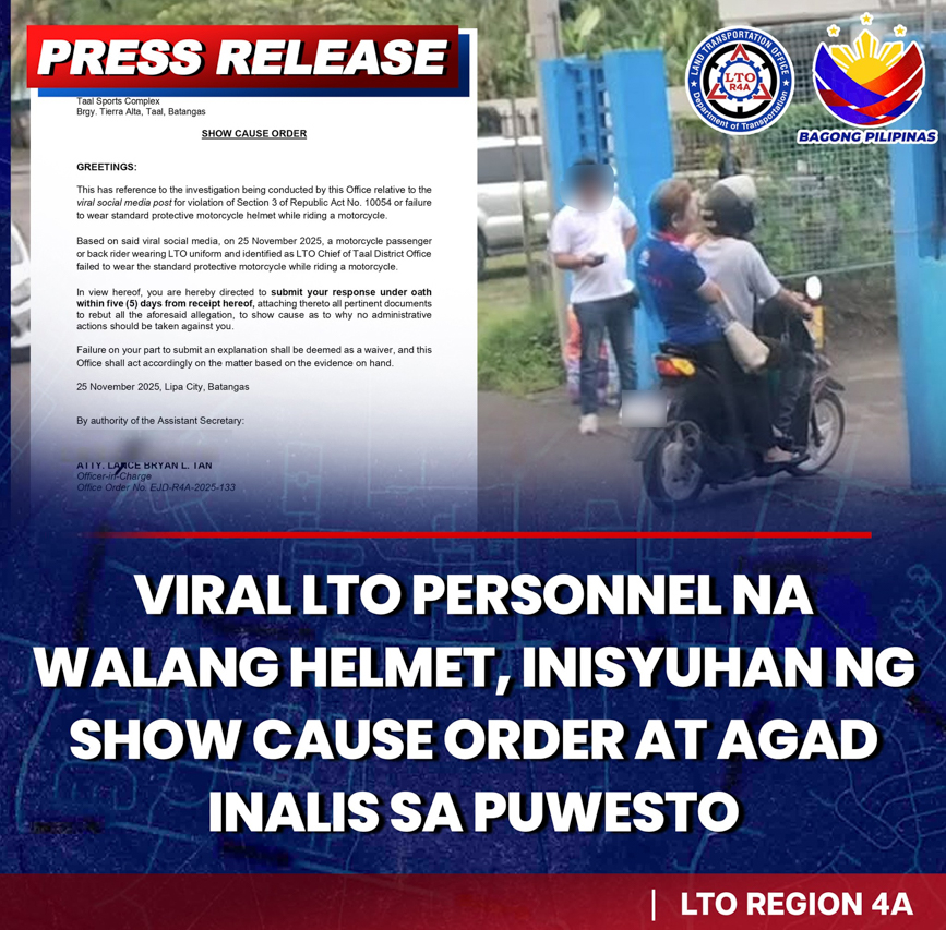 Recently, a Show Cause Order (SCO) was issued to LTO Taal Extension Office chief Gilda Zubia, requiring her to explain why administrative charges and other sanctions should not be imposed on her. This came after she was photographed riding a motorcycle without a safety helmet—a violation that quickly went viral on social media.