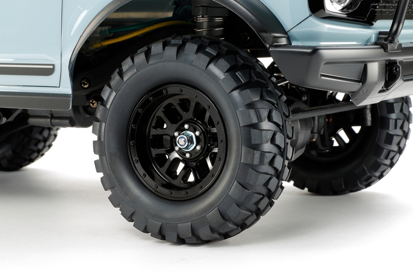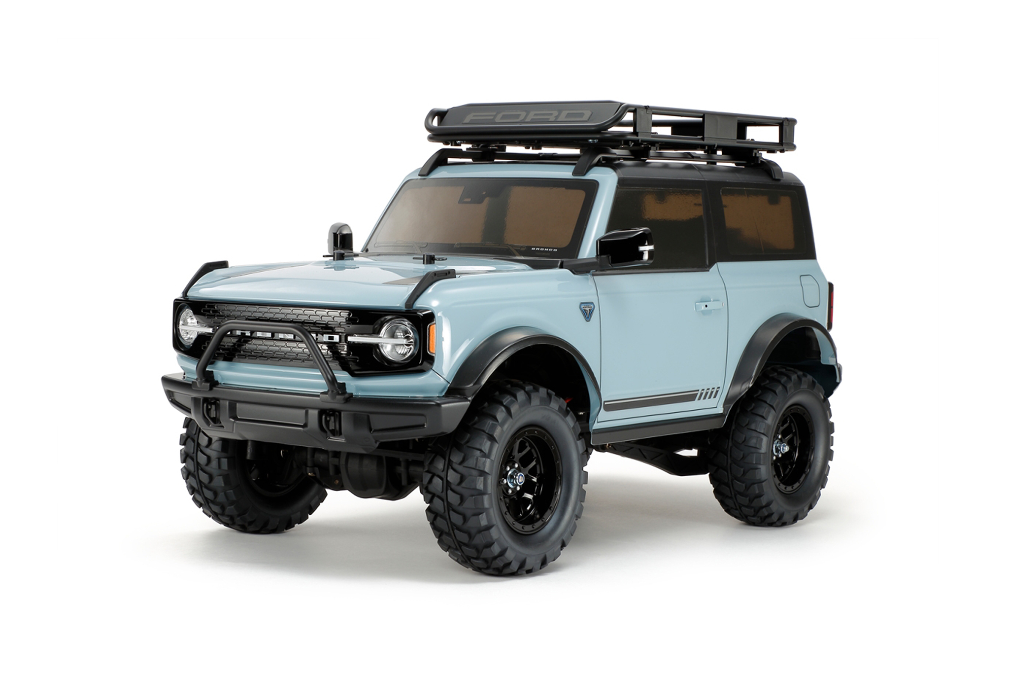 As for the kit itself, Tamiya did a great job recreating the Bronco's design. It’s based on the two-door model and is outfitted with off-road bits, including a front metal bumper, a roof rack, wider fender flares, and a Bronco-branded spare tire cover. Black 12-spoke wheels wrapped in rubber tires ensure the crawler will have grip in nearly all kinds of terrain.