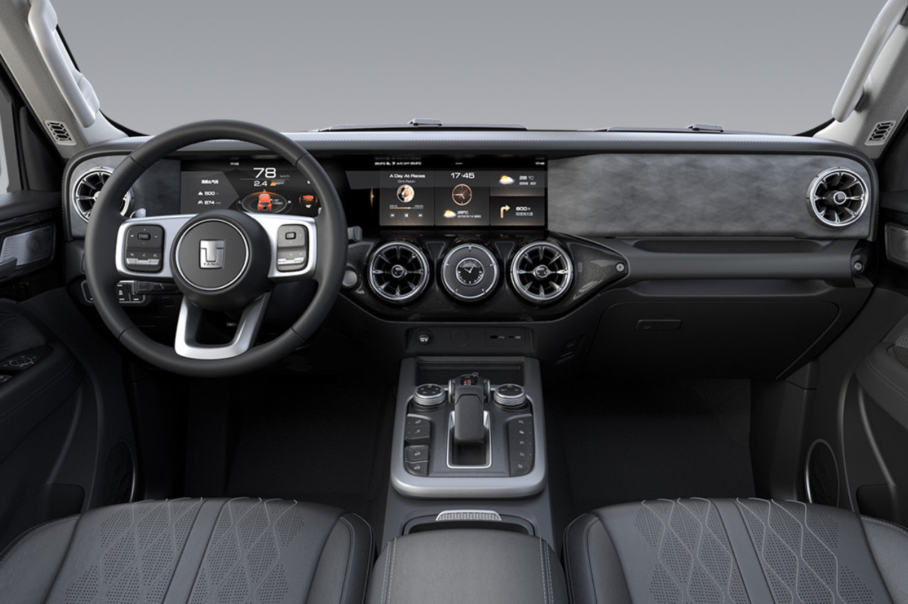 Judging by the boxy and almost old-school look of the vehicle, you can tell that it really is supposed to be a 4x4. The interior, however, is quite modern with a glass cockpit dashboard design, an almost retro steering wheel, and a rather symmetrical approach to the center console for the shifter and 4x4 dials.