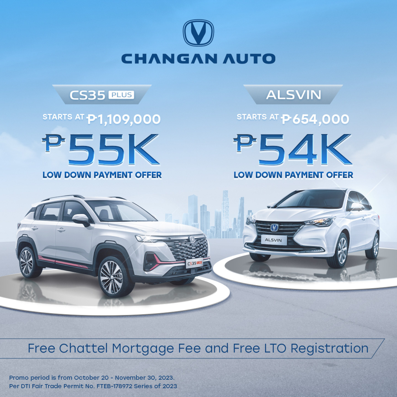 Changan Auto Philippines offers a low downpayment deal for the Alsvin sedan and the CS35 Plus. Get the Alsvin with a low downpayment offer of PHP 54,000, and the CS35 Plus for as low as PHP 55,000.