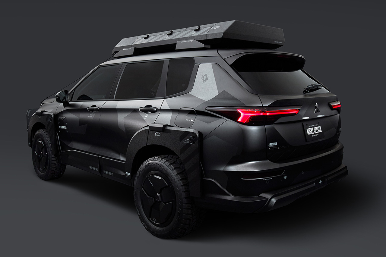 One of those is the Outlander PHEV Night Seeker Concept, which features an exterior design inspired by Metal Gear Solid. Based on the recently updated plug-in hybrid crossover, the Night Seeker Concept features a custom body kit, blacked-out alloy wheels wrapped in all-terrain tires, flared wheel arches, and a custom roof rack that could practically carry any type of equipment.