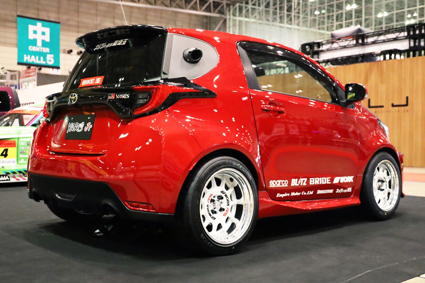 Meet the Yaris Jr. It may look like a scaled-down GR Yaris, but look closely and see how small it is in comparison to the standard hot hatchback. By now, you can tell it’s not your typical GR Yaris. Instead, it’s a Toyota iQ (same as the Aston Martin Cygnet) but with the front and rear end of Toyota’s homologation model grafted on. In addition, the team at Saijidai even gave the Yaris Jr proper wide fenders similar to the GR Yaris. A set of Work wheels and a carbon fiber hood complete the iQ’s exterior transformation.