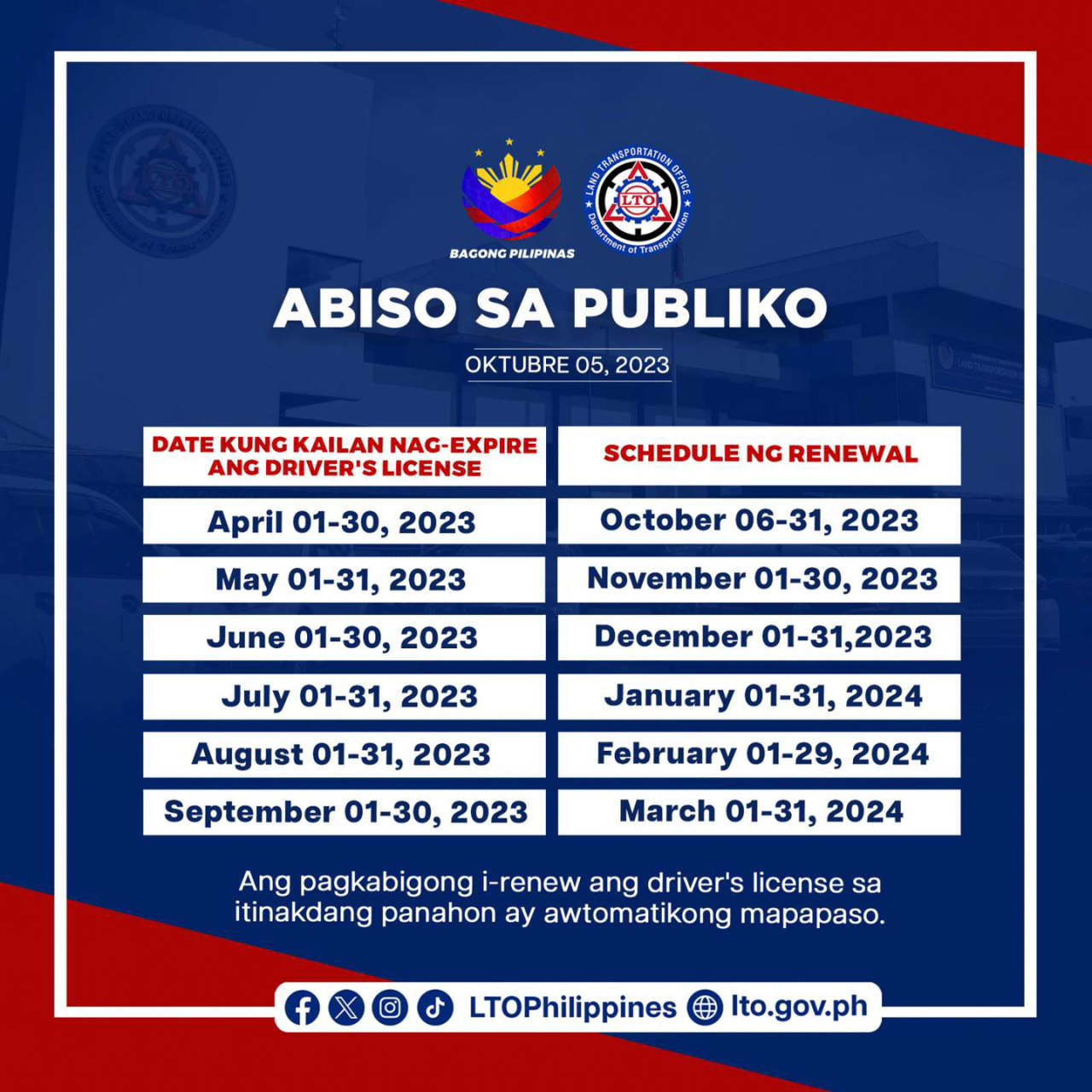 LTO has announced the renewal schedules for driver's licenses that expired from April to September 2023. The schedule for renewal begins tomorrow, October 6 for those who have expired licenses covering the dates of April 1 to 30, 2023. This will go on until the September batch finishes their renewal schedule by March 31, 2024.