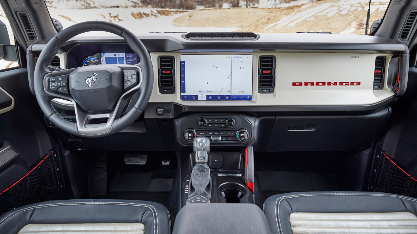 Inside, the one-off SUV features color-matched Wimbledon White painted instrument panel with vent accent, grab handles, and Bronco brand lettering in red. The seating and door panel trim are updated with matching white vinyl contrasting the black seat surround and interior trim.
